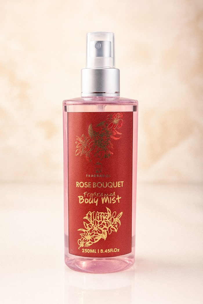 Rose Bouquet Fragranced Body Mist. A captivating floral body spray infused with rose, green apple, geranium, hyacinth, iris, musk and a touch of caramel. Perfect for lovers of long-lasting rose scents, feminine fragrances and lightweight everyday perfume mists.